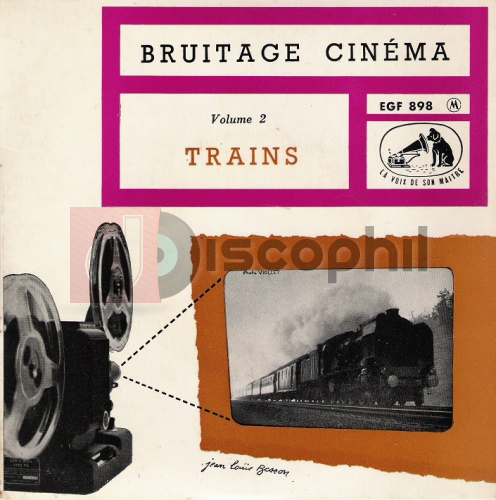 BRUITAGE CINÉMA. Volume 02. LA VOIX DE SON MAITRE EGF 898. Titres : - Départ express - Passage sur un pont métallique - Train en marche - Départ d'un train de marchandises avec coup de sifflet - Train sous un tunnel, locomotive peinant en côte - Locomotive s'arrêtant - Locomotive manœuvrant, puis arrêtée. POCHETTE ET DISQUE EN BON ÉTAT.