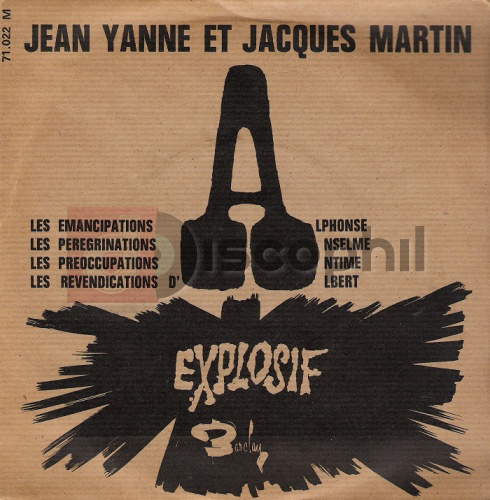 Jean YANNE et Jacques MARTIN. Barclay 71 022. Titres : - Les émancipations d'Alphonse - Les pérégrinations d'Anselme - Les préoccupations d'Antime - Les revendications d'Albert. POCHETTE ET DISQUE EN BON ÉTAT.
