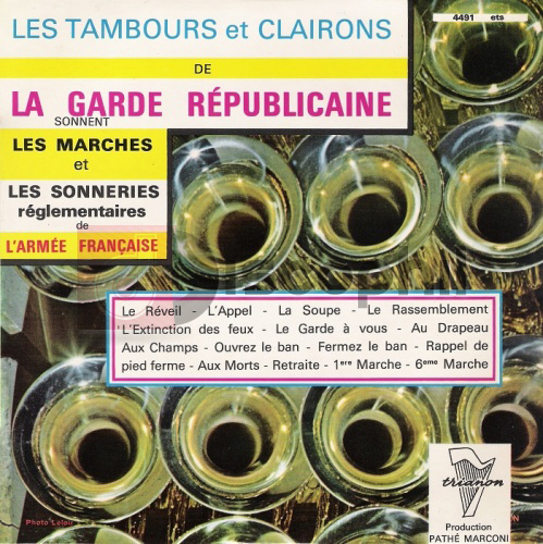 LA GARDE RÉPUBLICAINE. LES MARCHES ET LES SONNERIES réglementaires de L’ARMÉE FRANÇAISE. TRIANON PATHÉ MARCONI 4491 ETS. Titres : - LE RÉVEIL - L'APPEL - LA SOUPE - LE RASSEMBLEMENT - L'EXTINCTION DES FEUX - LE GARDE-A-VOUS - AU DRAPEAU - AUX CHAMPS - OUVREZ LE BAN - FERMEZ LE BAN - RAPPEL DE PIED FERME - AUX MORTS - 1ère MARCHE - 6ème MARCHE - RETRAITE. SLEEVE AND VINYL IN VERY GOOD CONDITION.