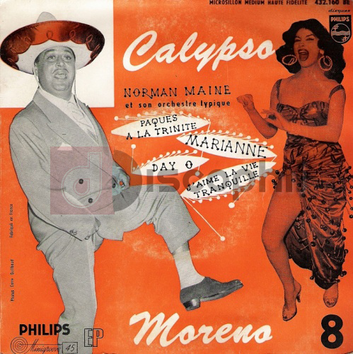 Dario MORENO. Philips 432 160. Titles : - Day O (The banana boat song) - Marianne - J'aime la vie tranquille - Pâques à la Trinité. Calypso Moreno, pochette avec Magali NOËL.