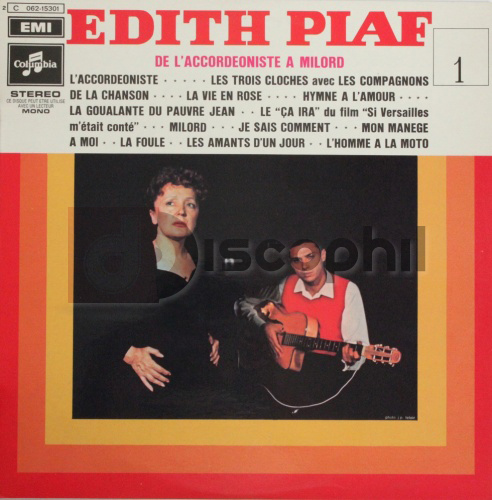Édith PIAF. EMI 62-15 301. Titles : - L'accordéoniste - Les trois cloches - La vie en rose - Hymne à l'amour - La goualante du pauvre Jean - Le "Ça ira" - Milord - Je sais comment - Mon manège à moi - La foule - Les amants d'un jour - L'homme à la moto. SLEEVE AND VINYL IN GOOD CONDITION.